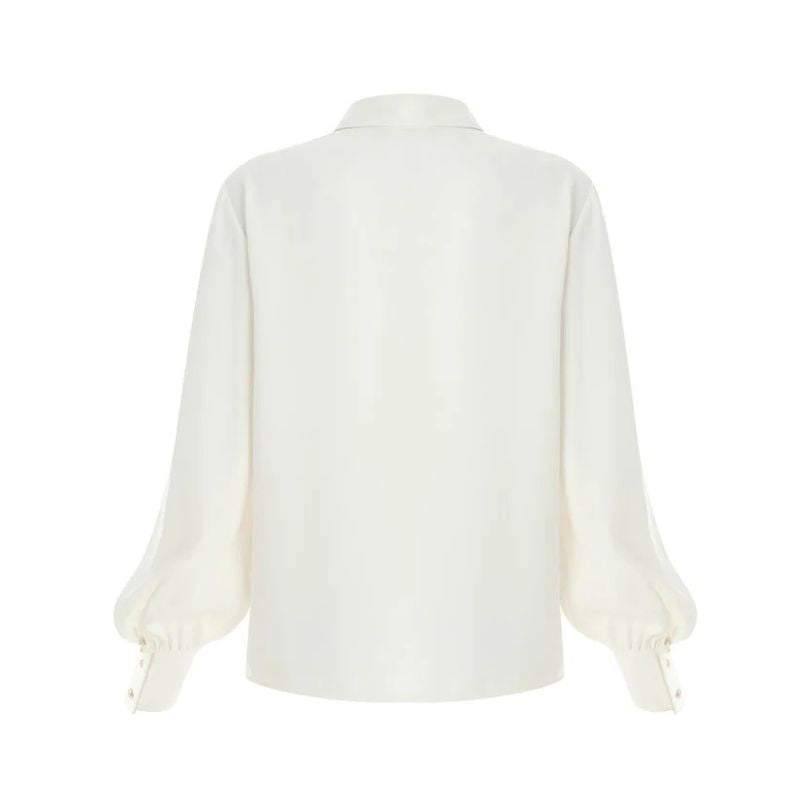 Sophisticated and timeless, this ivory blouse is designed to elevate both workwear and occasion outfits. Crafted in a fluid fabric that drapes beautifully, it features a sharp collar with a subtle keyhole cut-out and button fastening for a modern twist. The long sleeves with buttoned cuffs add a touch of elegance, while the relaxed fit ensures comfort and versatility.