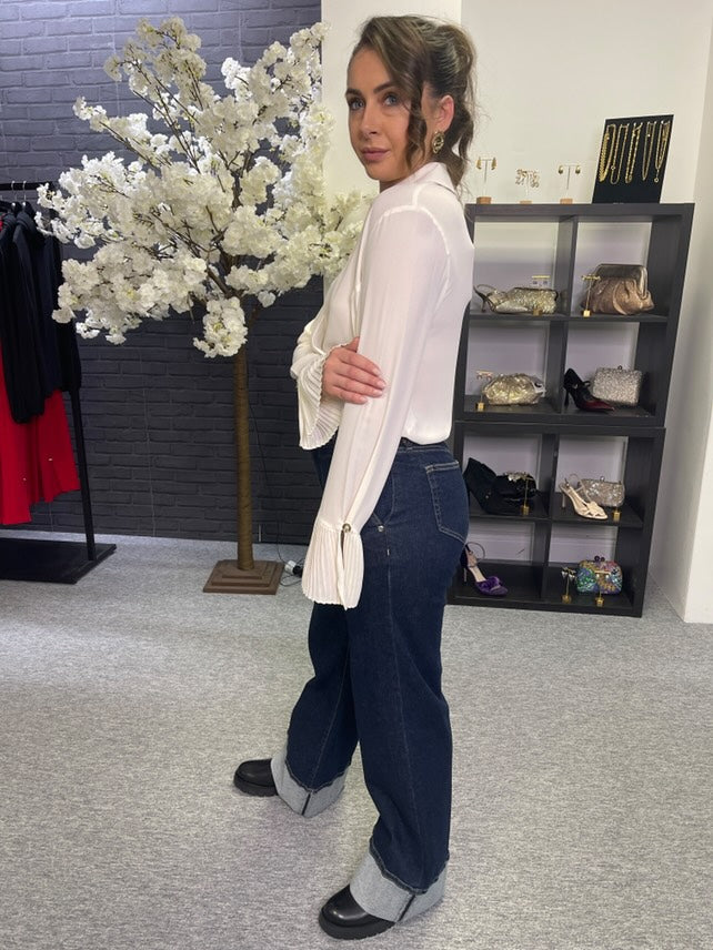 The blouse is defined by its exaggerated collar — a bold, architectural detail that adds a sharp, contemporary edge. Long sleeves end in fully pleated cuffs, offering subtle volume and textural contrast that bring a refined finish to the look.