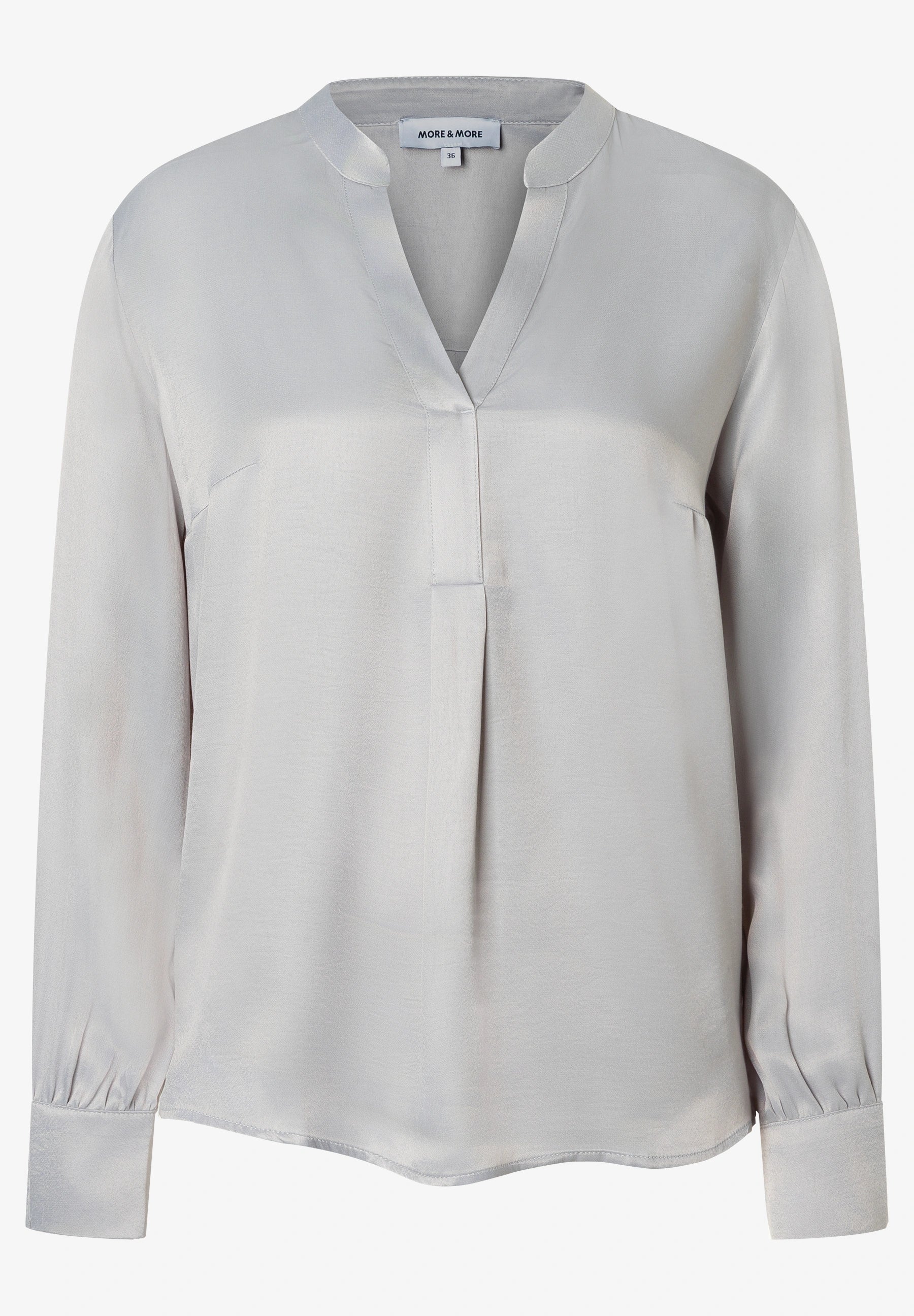 More & More Paloma Grey Blouse This flowing satin blouse from MORE & MORE, featuring a small stand-up collar and a box pleat in the back, offers numerous styling options and creates an elegant look. Whether paired with classic business trousers, casual jeans, or a slim pencil skirt, this silky-smooth slip-on blouse is a stylish companion for a variety of occasions.