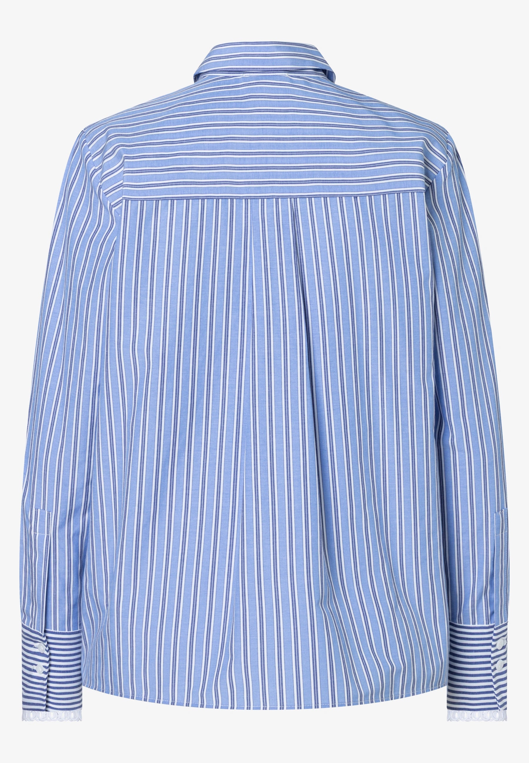 More & More Striped Blue Blouse. This blue and white striped blouse adds a touch of lightness to any style. The classic shirt collar and modern, relaxed silhouette create a timeless, youthful vibe. Perfect with jeans, dress pants, and sporty skirts.