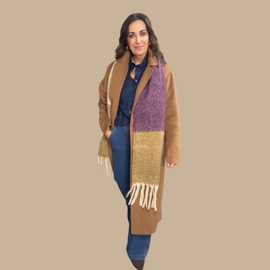 Here this stunning shirt is styled with the Bariloche Caraca Coat, The Numph Nuamber Jeans and to finish the look she has added a pop of colour with our Verb To Do scarf